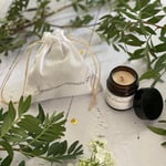 Une petite pochette en coton avec inscription "Joyeux anniversaire" fermée par un lien doré, Imprimée à la main.